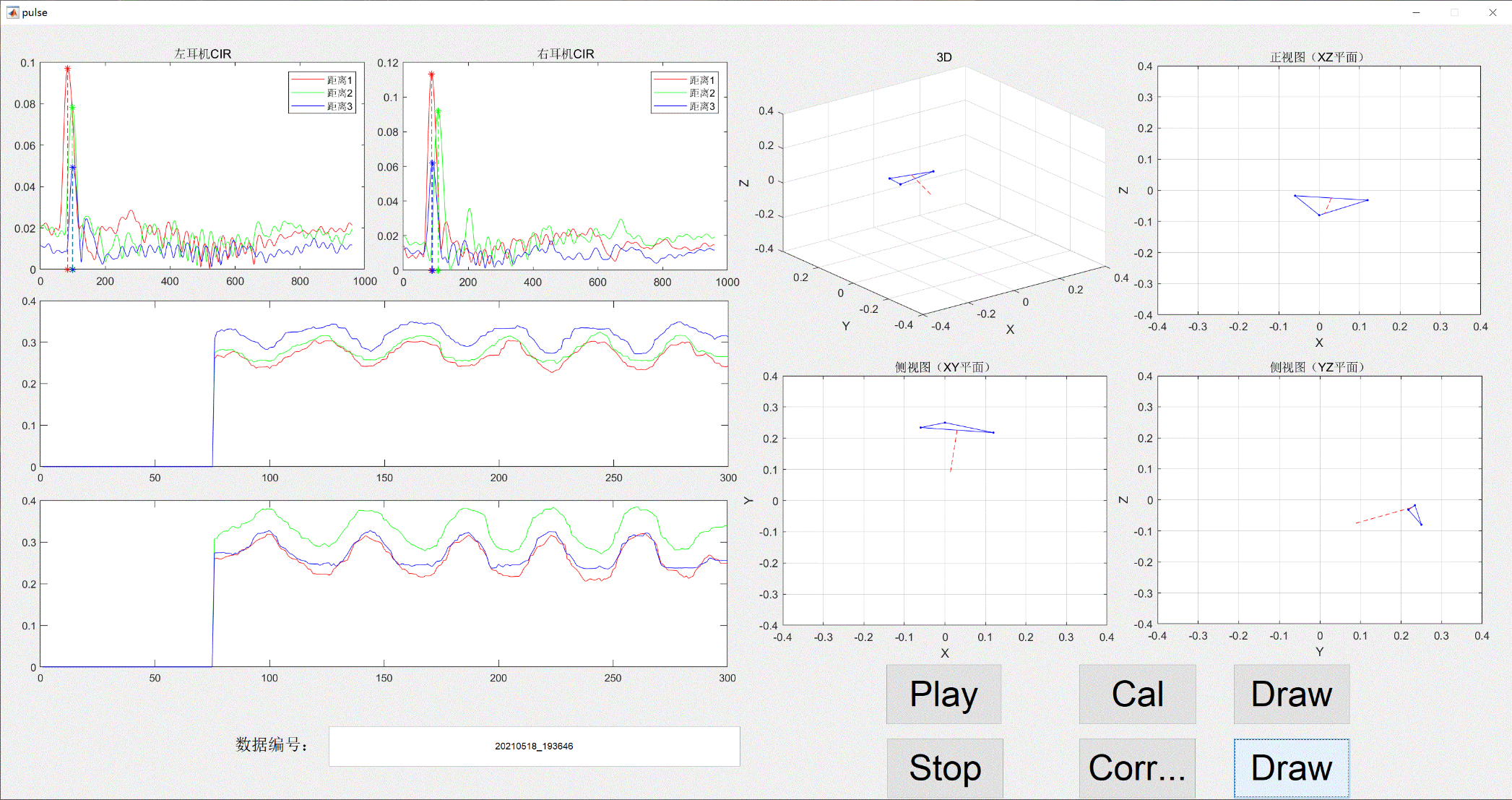- 目前实验的展示效果不好,只是用matlab画3D和2D画图,而且只是用两个发射端的点和一个固定点组成的三角形来代表头部旋转,可能需要一个真实头部的三维建模看起会好一些?比如unity之类的游戏引擎。